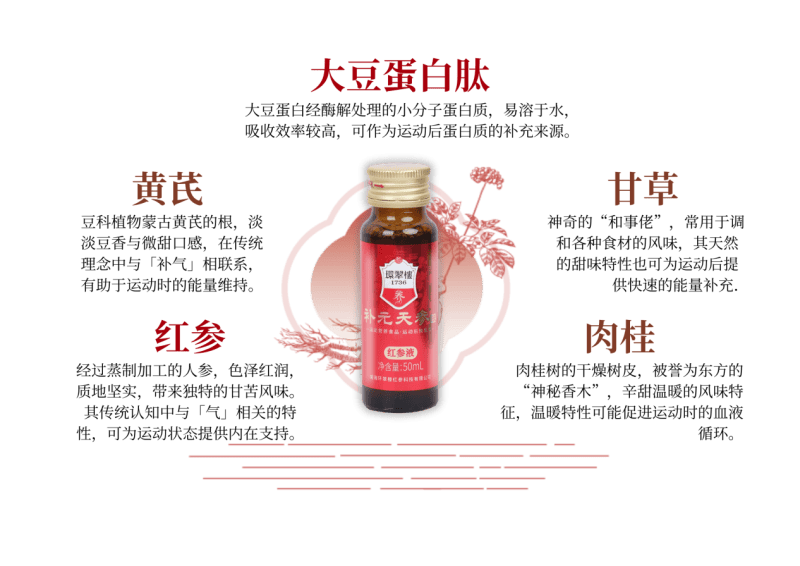 铁人三项赛场上,运动员冲过终点后的疲惫,本质是身体机能的极限透支——肌肉纤维损伤、乳酸堆积、代谢紊乱,每一项都考验着恢复效率。环翠楼红参的解决方案,藏在古法为体、科技为用的产品逻辑里。其明星产品补元天参红参黄芪蛋白肽液,核心配方源自明代《博爱心鉴》中的保元汤,以红参大补元气、黄芪温阳通脉,搭配甘草调和、肉桂引火归元,从中医理论出发实现整体调理。